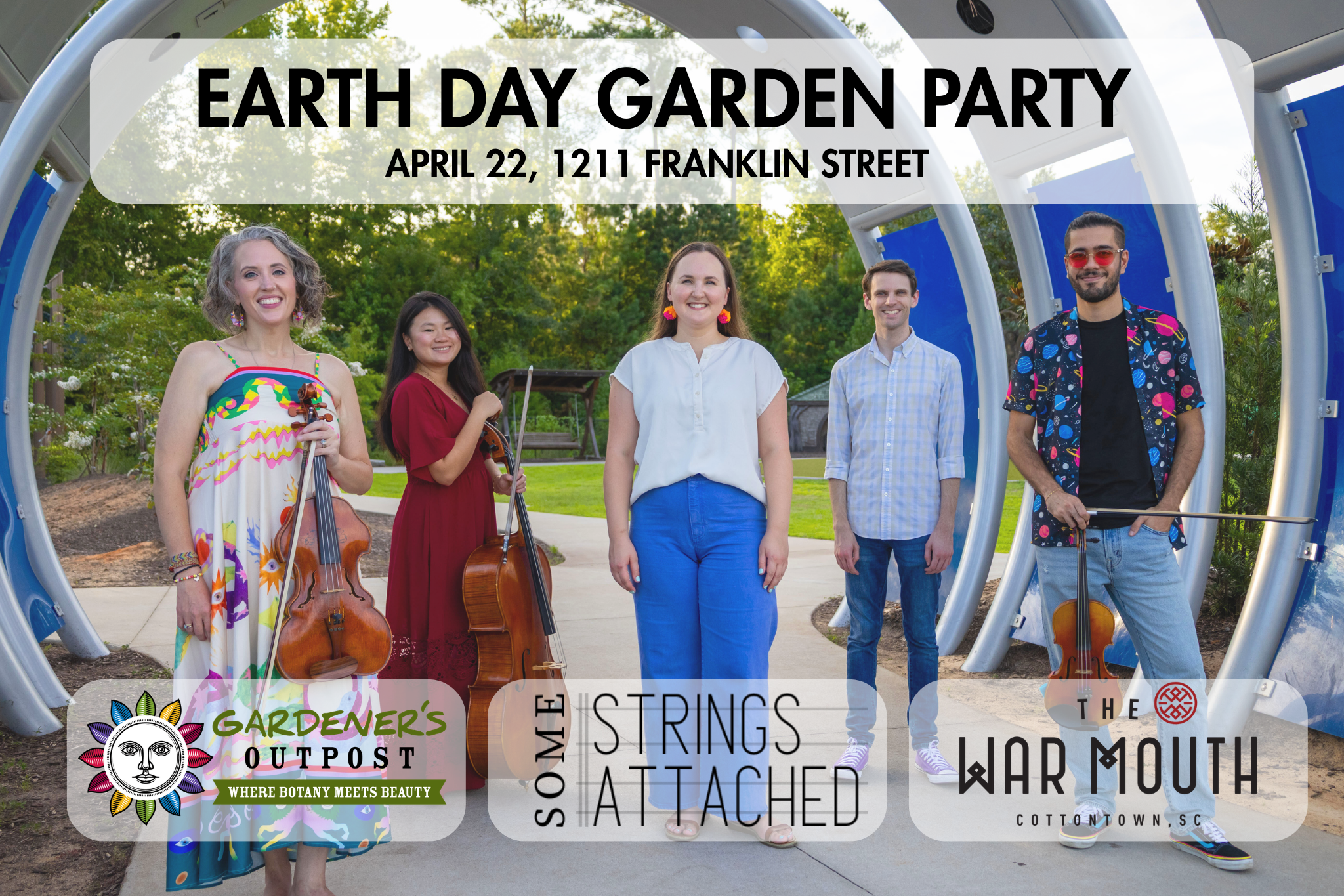 Celebrate Earth Day—garden party style! Some Strings Attached will share an eclectic concert of classical and contemporary chamber music. Enjoy tasty hors d’oeuvres from War Mouth as you sit among the flowers and fauna at Gardener’s Outpost. Bring a lawn chair — limited seating available. Beer & wine available for purchase.